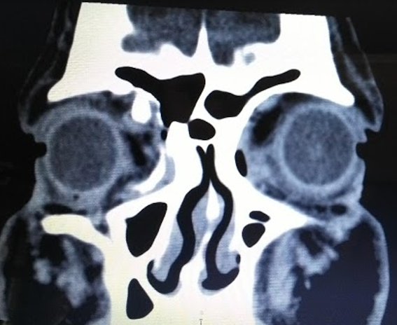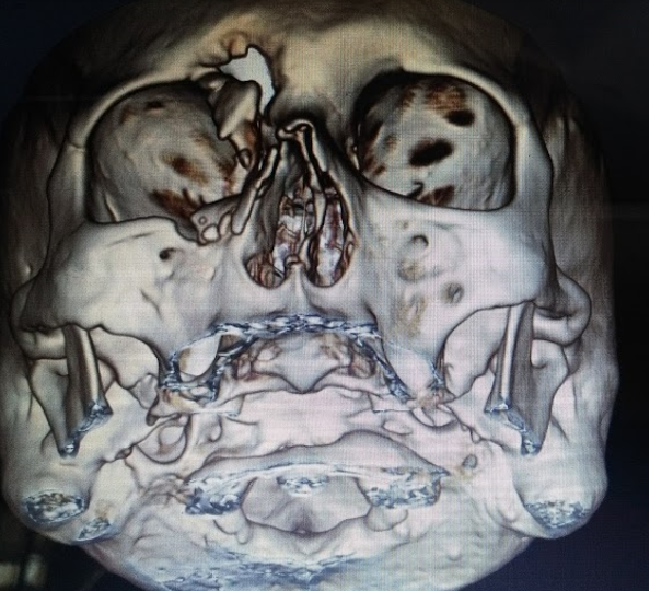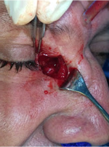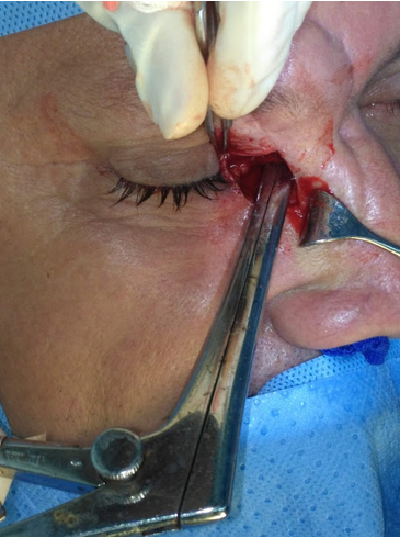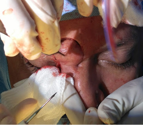 Postoperatorio mediato de 7 días, presenta dehiscencia de puntos de región frontal pero se deciden retirar y permitir cierre por segunda intención. Paciente niega epifora y refiere menos obstrucción nasal.